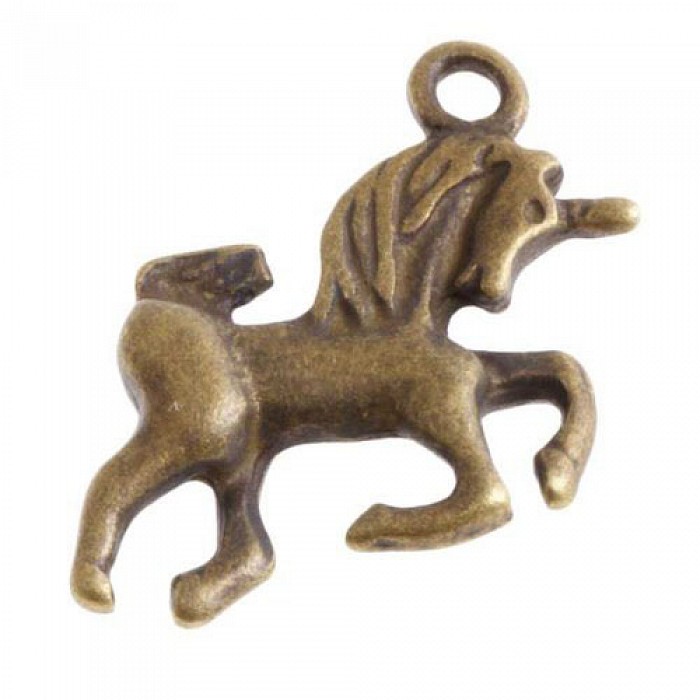 Kovové oboustranné přívěsky starozlaté barvy ve tvaru jednorožce.