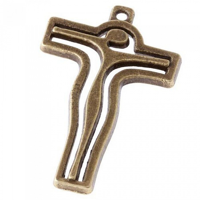 Kovové oboustranné přívěsky starozlaté barvy ve tvaru kříže s postavou.