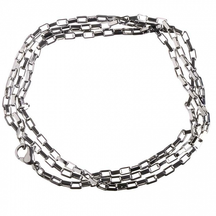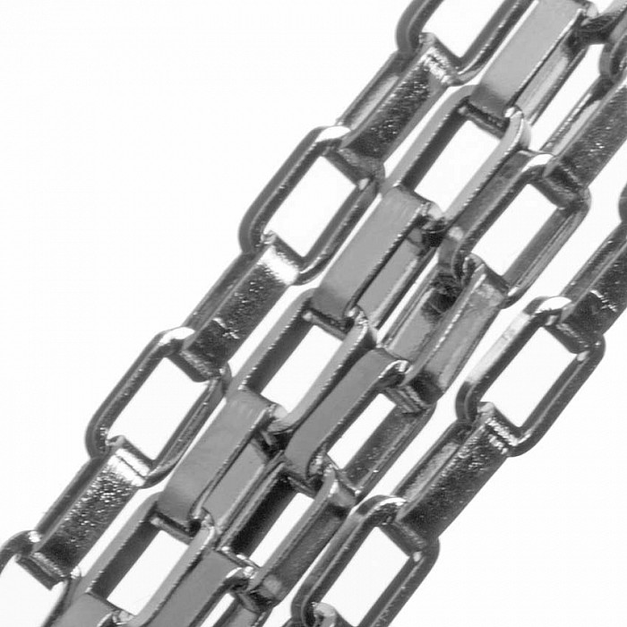 Řetízek z nerezové oceli 304 s obdélníkovým očkem z plochého drátku dlouhý 50 cm a ukončený karabinkou.