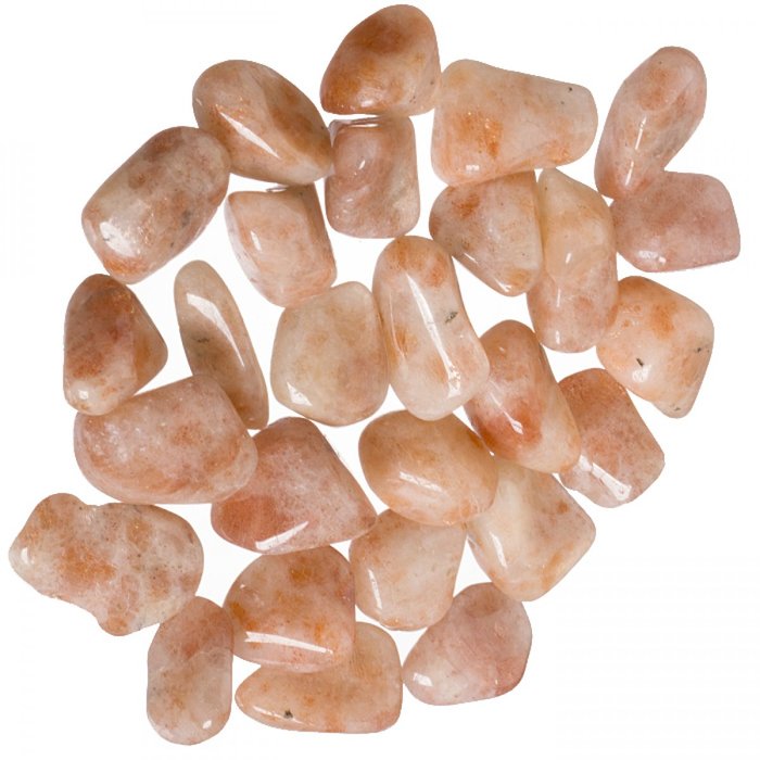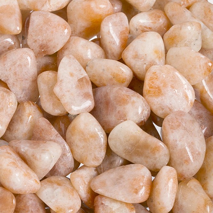 Tromlované drobné kamínky slunečního kamene na výrobu kamenné bižuterie. Mírně nepravidelné, přírodní minerál.