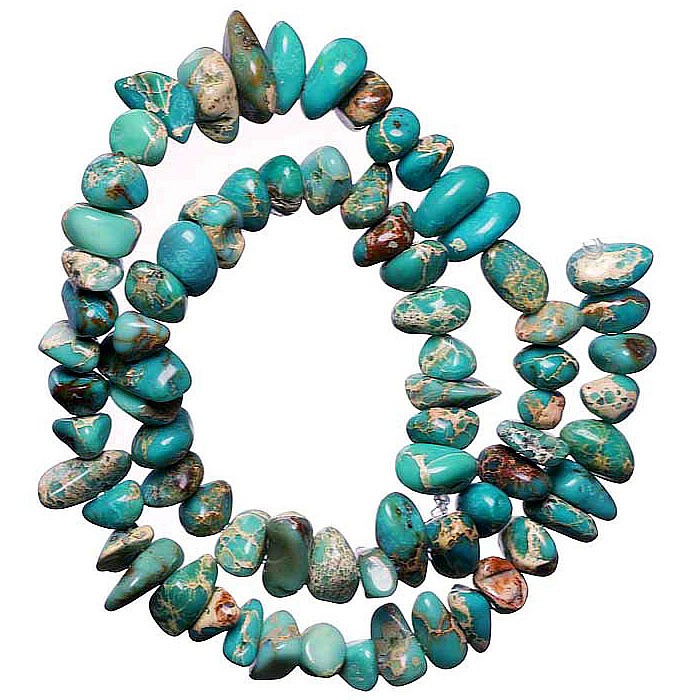 Vrtané valounky barveného modrého variscitu. Korálky mají nepravidelný tvar.