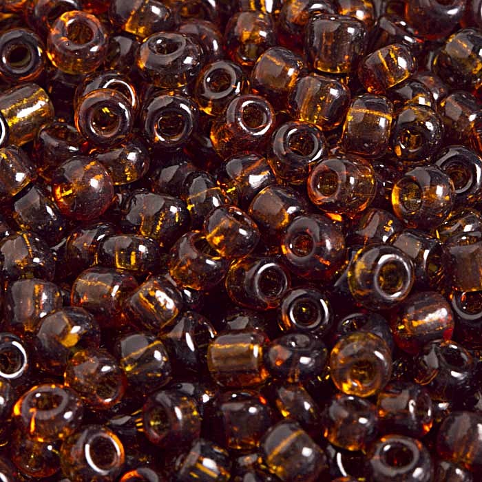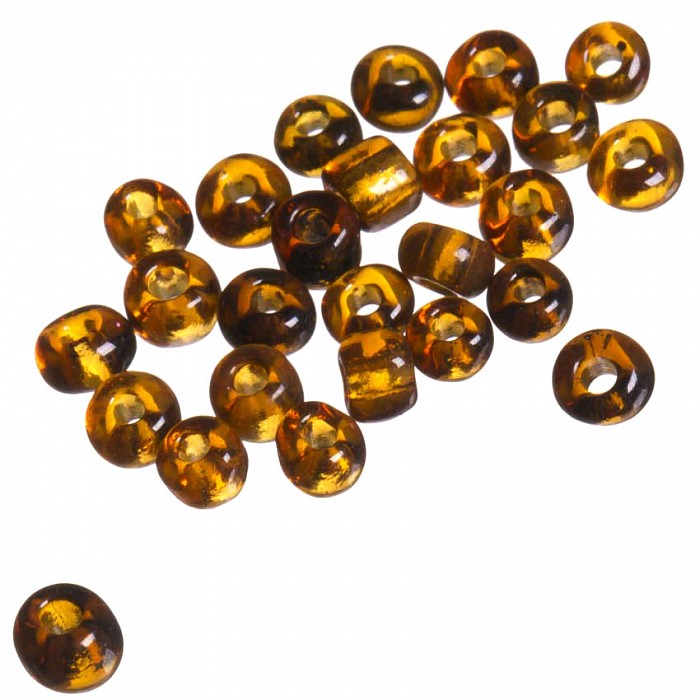 Skleněný, průsvitný rokajl hnědé barvy. Rokajl je nepravidelný, vhodný pro freeform, pro navlékání, drátování apod.